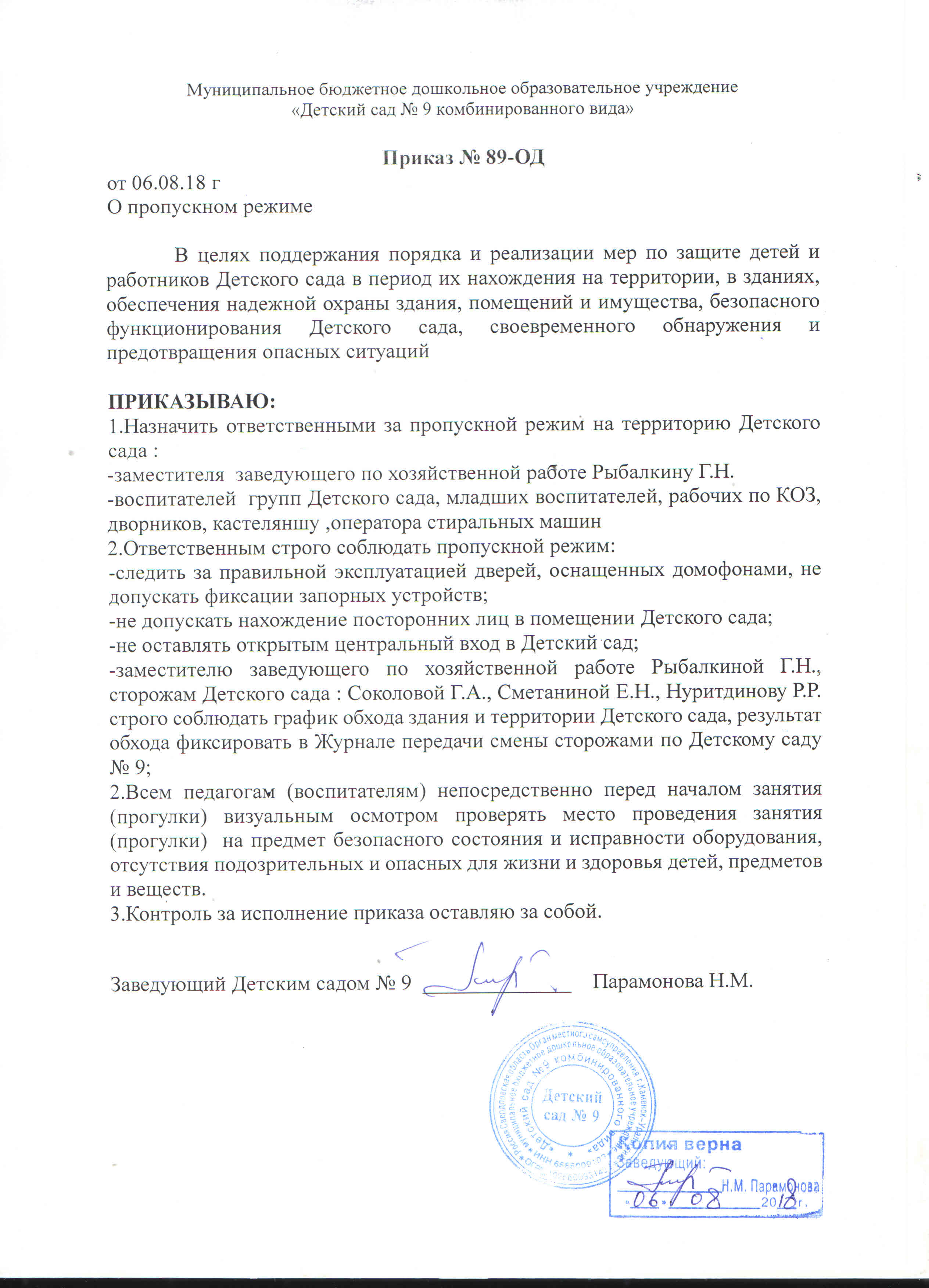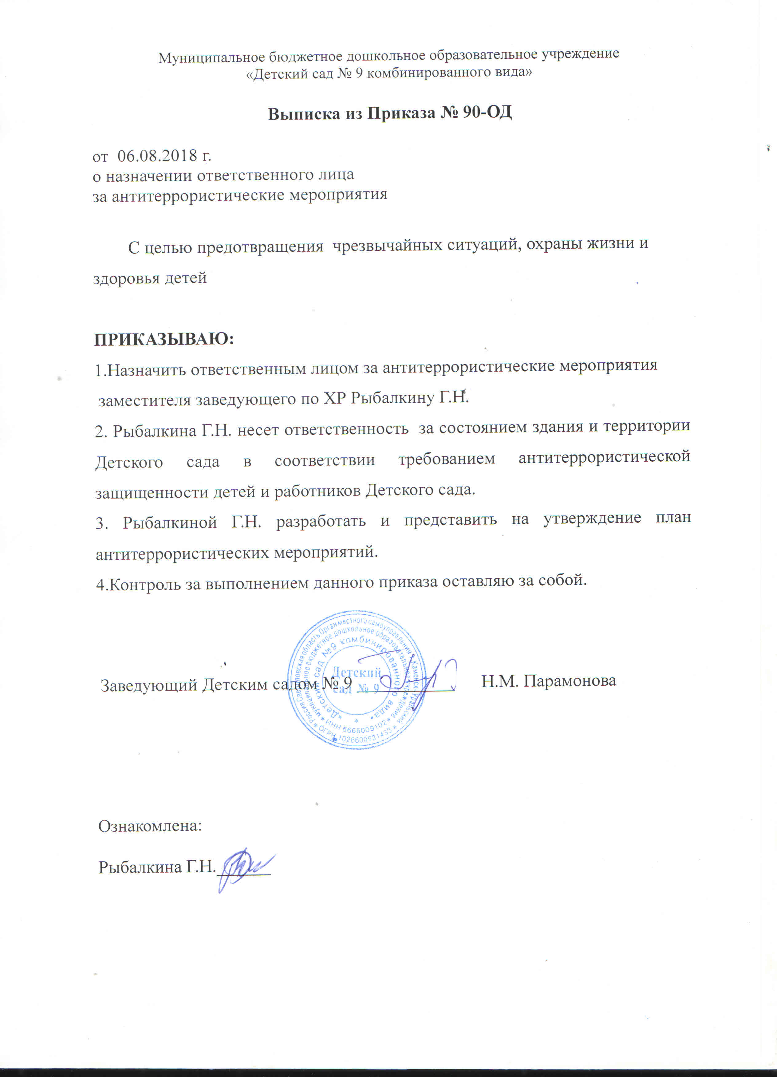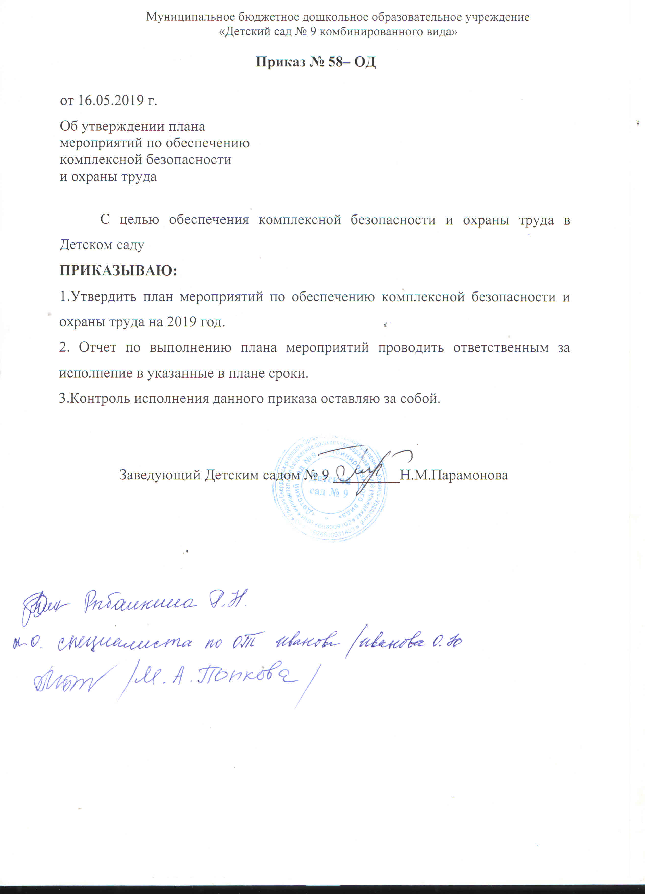 Приказ 58-ОД Об утверждении плана мероприятий по обеспечению комплексной безопасности и охраны труда План Мероприятий по обеспечению комплексной безопасности и охраны труда в МБДОУ Детский сад №9 План меропрятий по антитеррористической и противодиверсионной защите объекта МБДОУ Детский сад №9 |