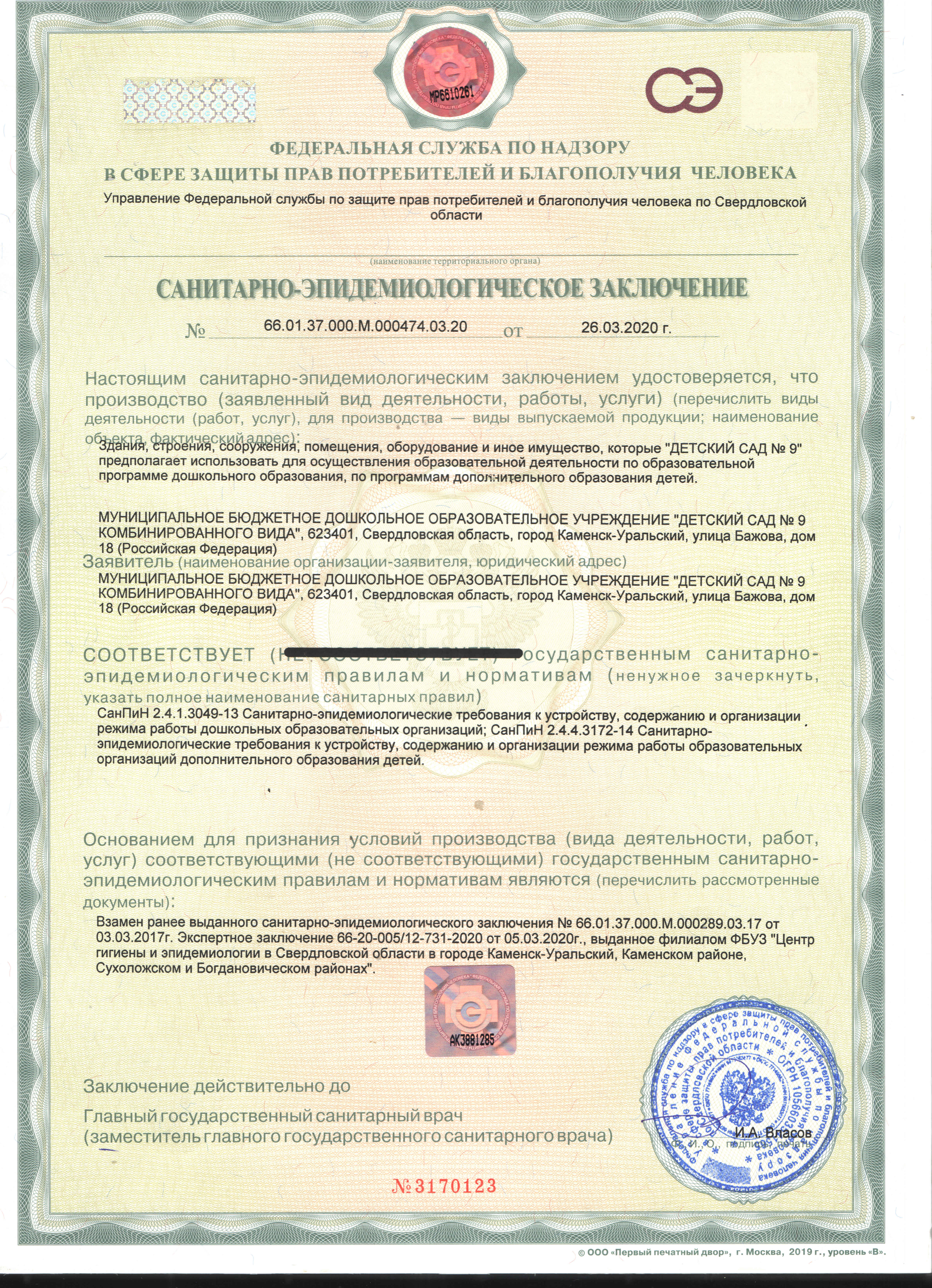 1.Санитарно эпидемиологическое заключение 2020г